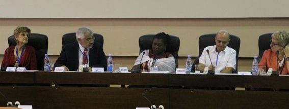 Algunas de las personas participantes del Panel “Promoción de la Salud: Aprender a transformar las Escuelas y las Universidades”. De izquierda a derecha: Gloria Torres (Cuba), Hiram Arroyo (Puerto Rico), Cirelda Carvajal (Cuba), Iván Darío Chahín (EDEX, Colombia) y Carmen Gallardo (España). Foto cortesía de José Ramón Martínez de la Universidad de Alicante.